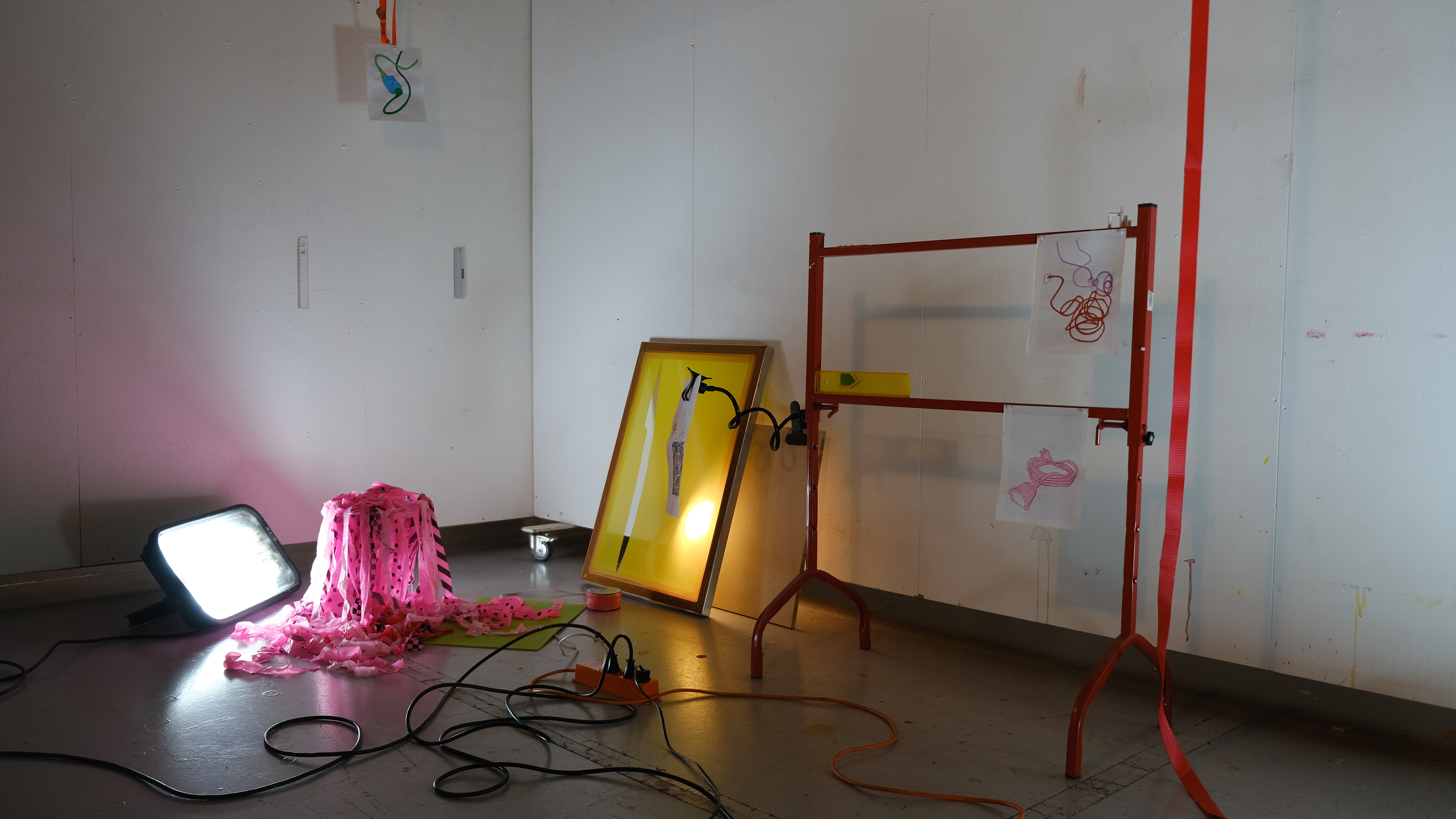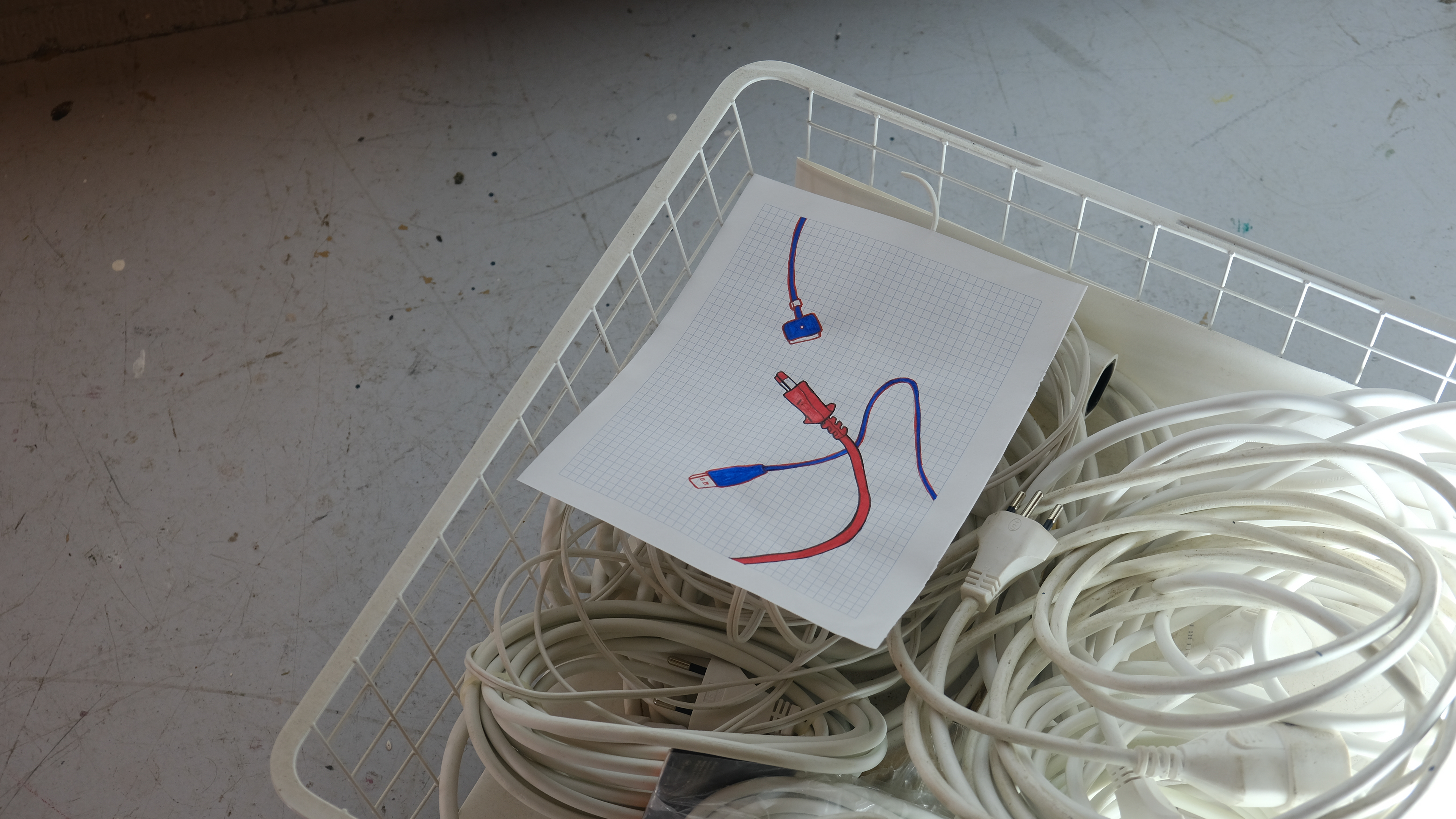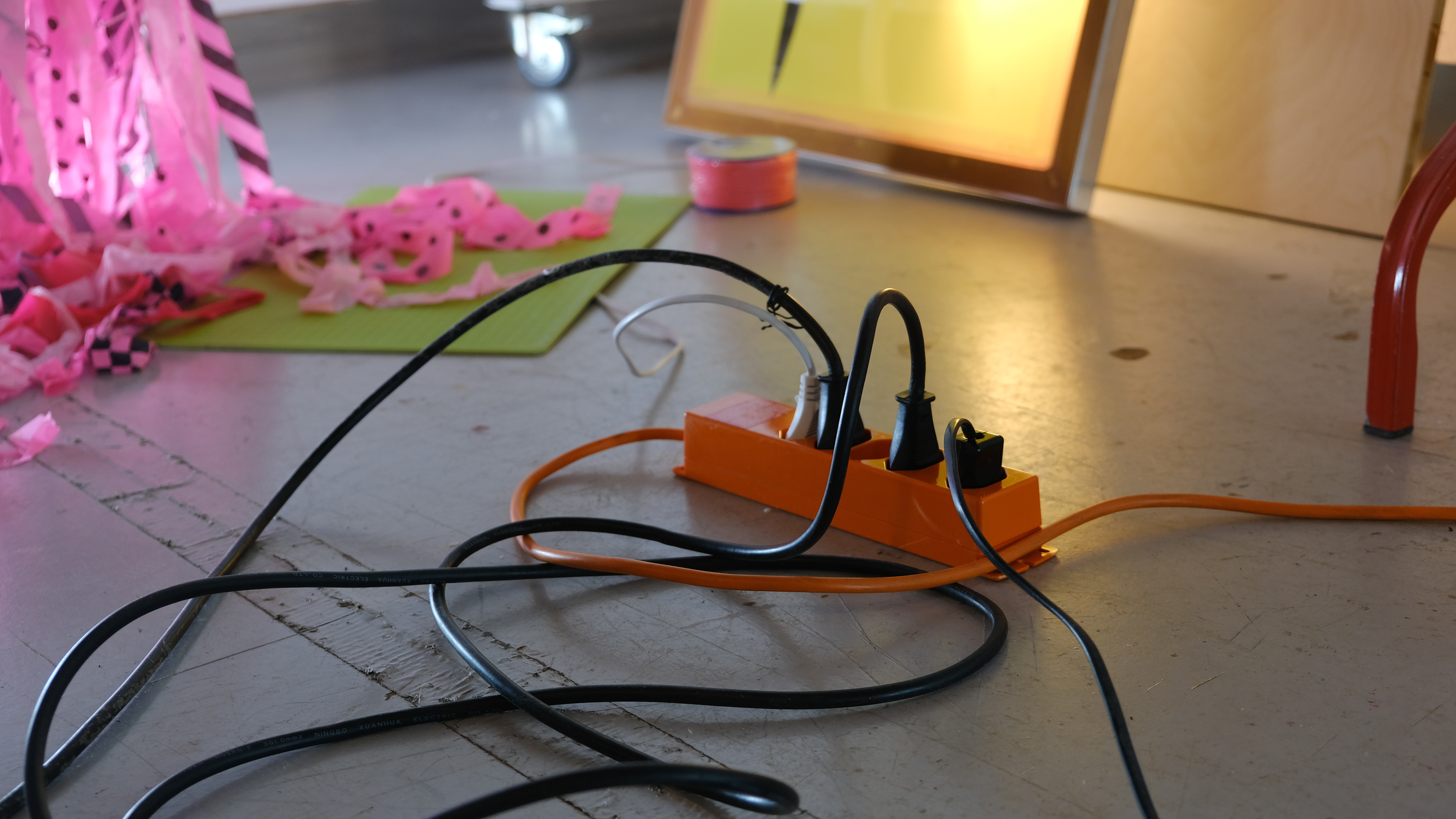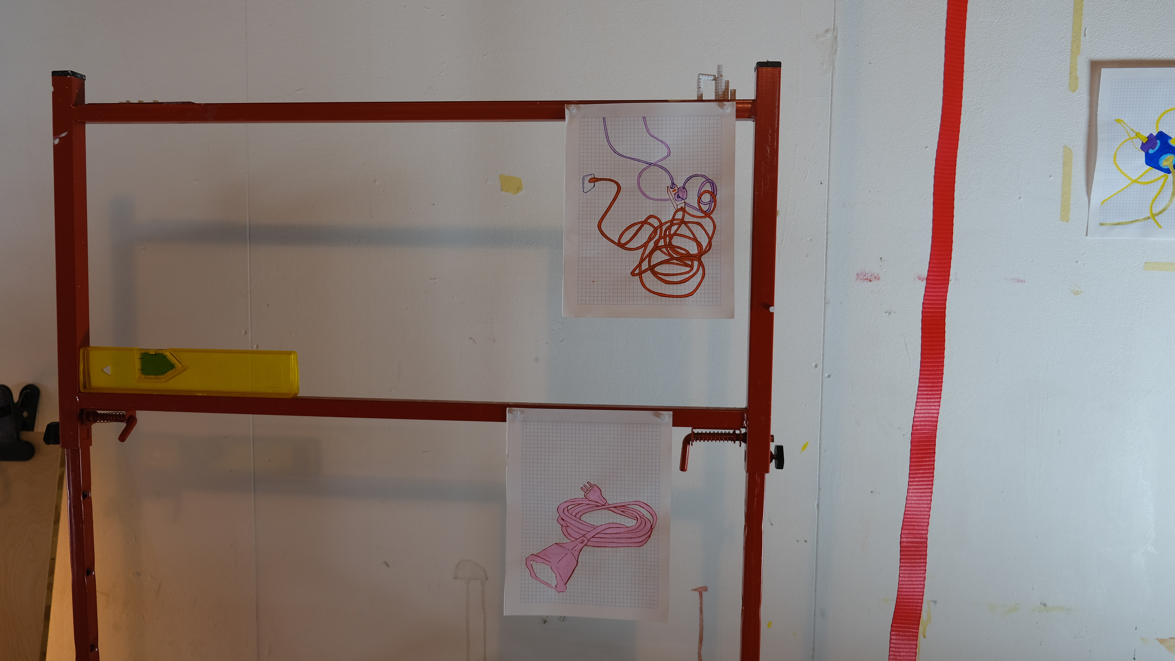 Drawings, magnets, rulers, several lamps, cutting-mat, ropes, safety stripes, metal drawer, cables