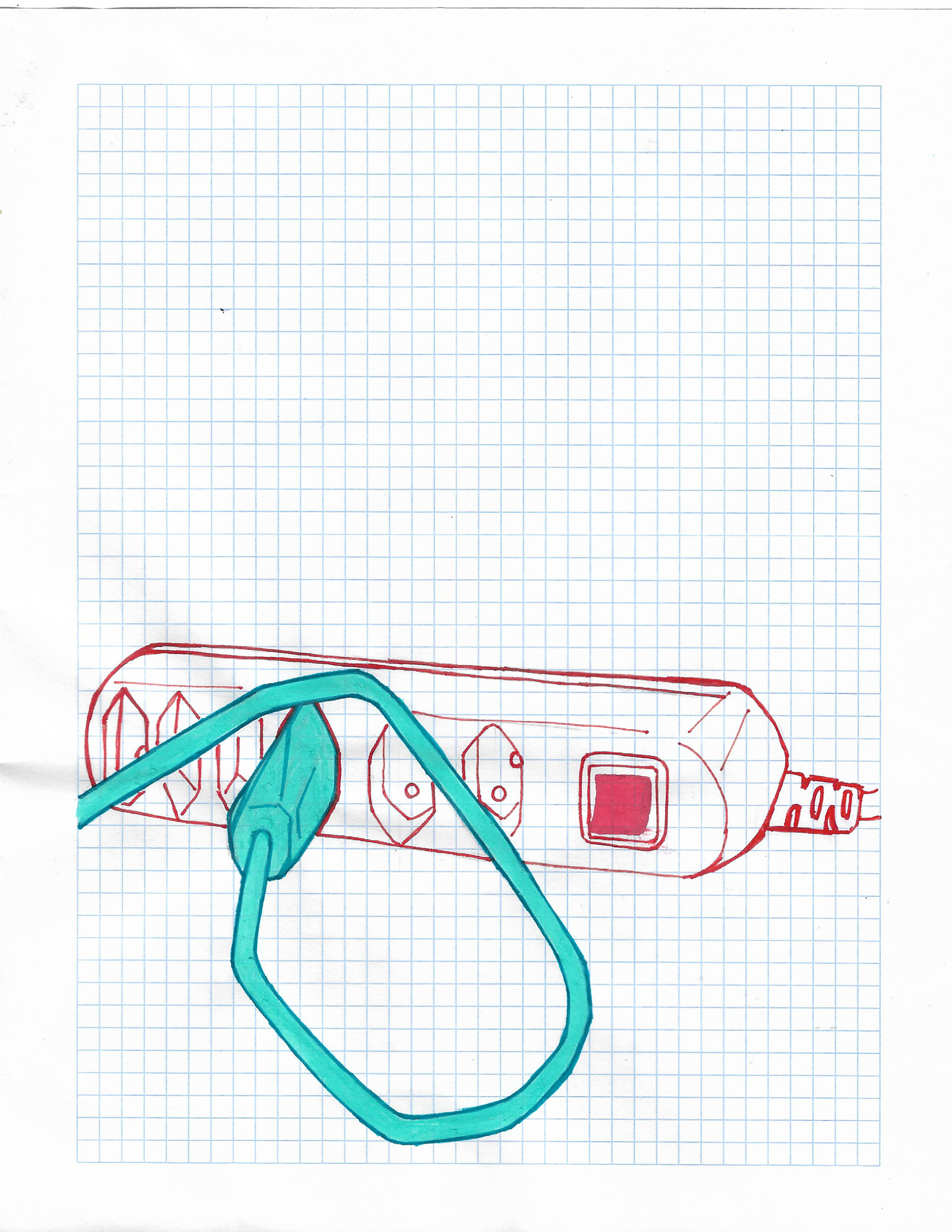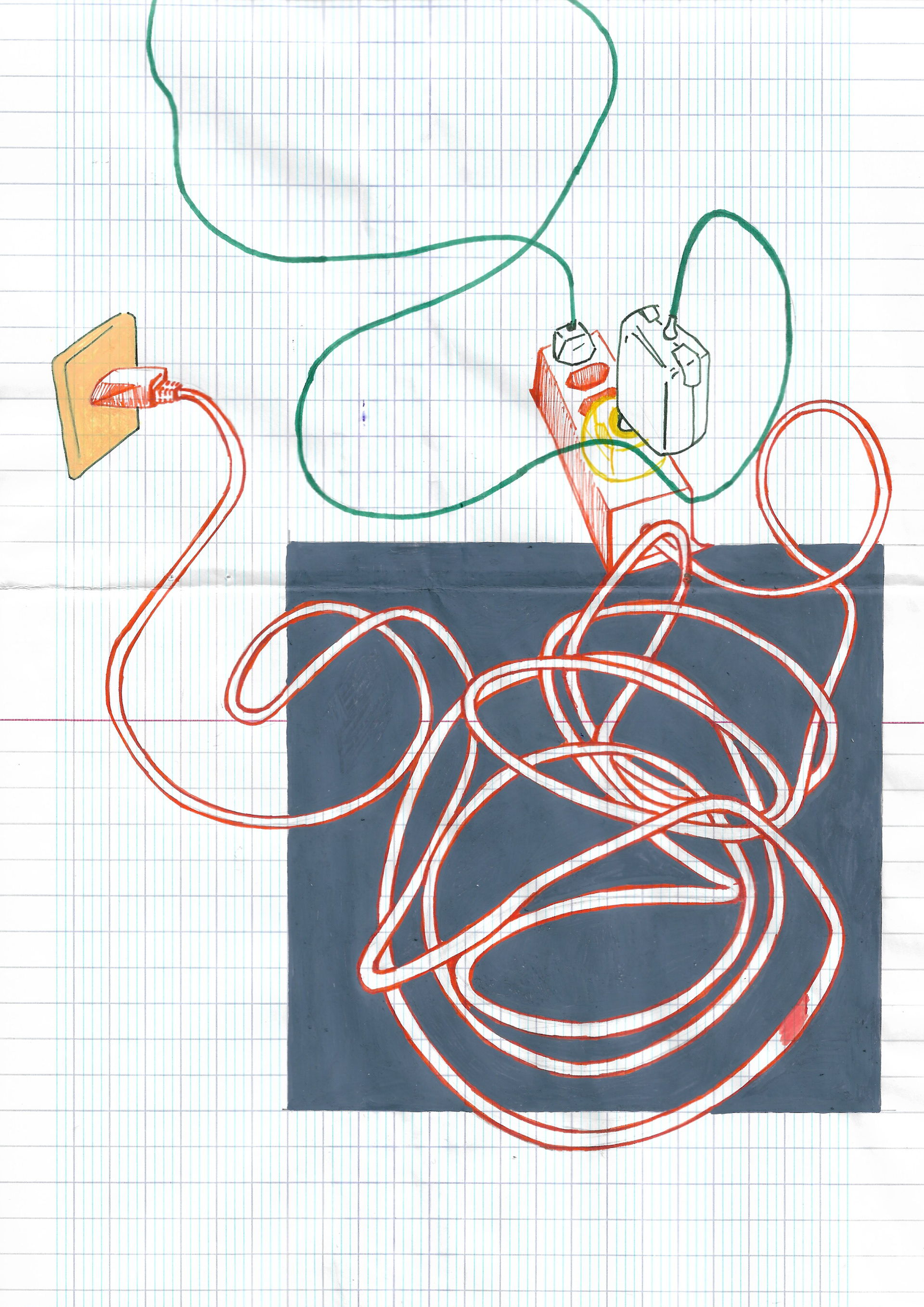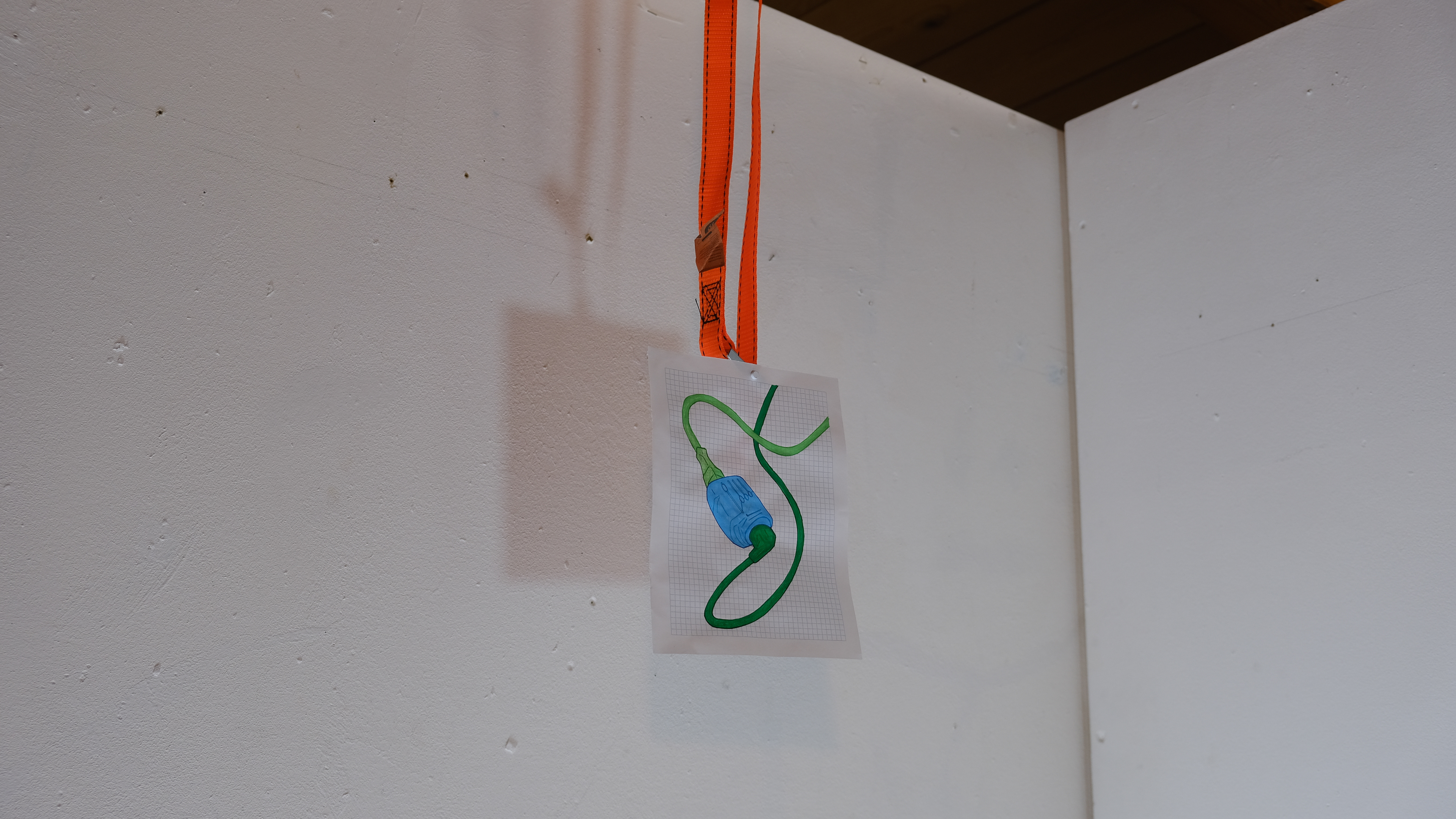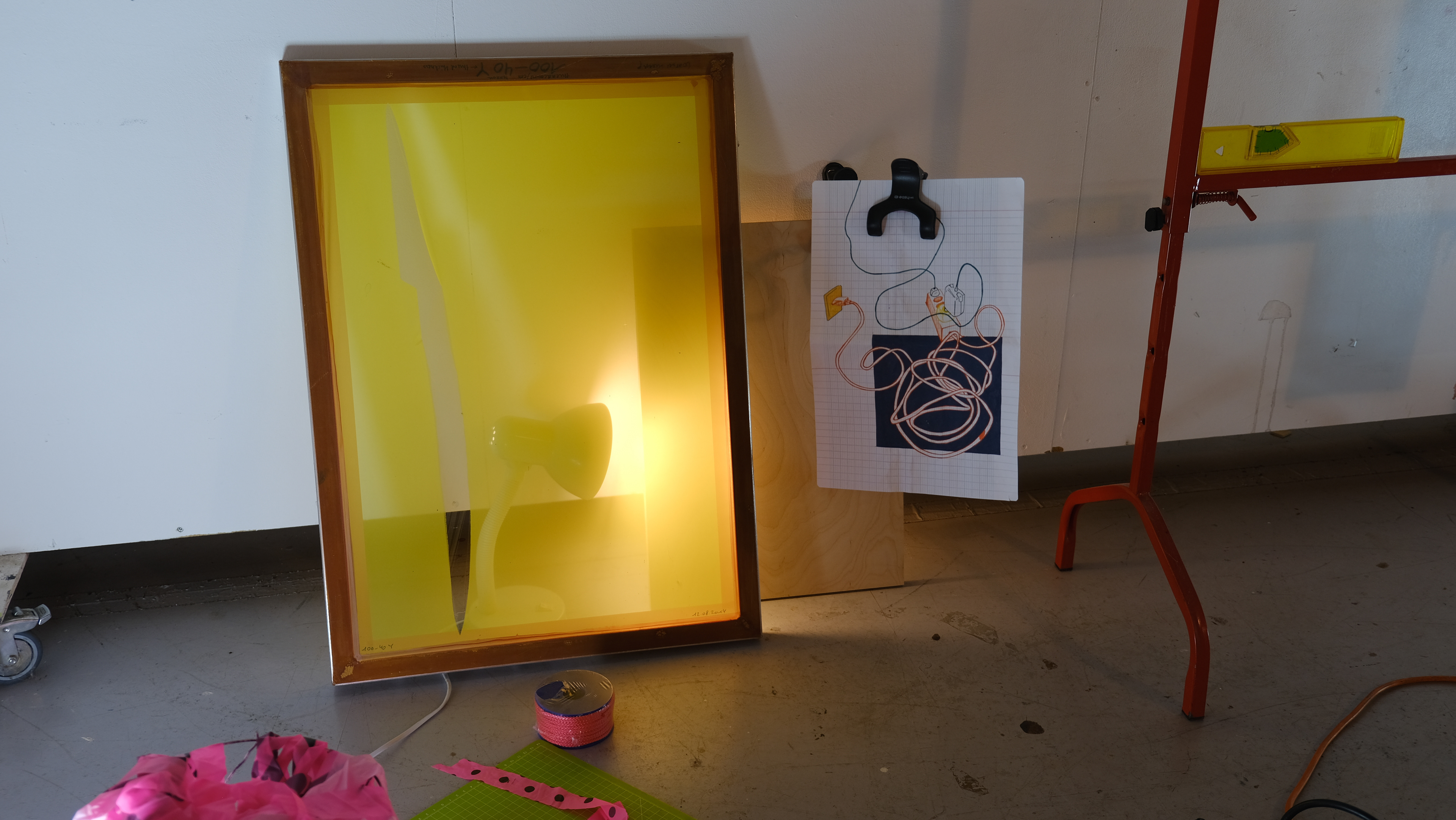 Drawings, magnets, rulers, several lamps, cutting-mat, ropes, safety stripes, metal drawer, cables