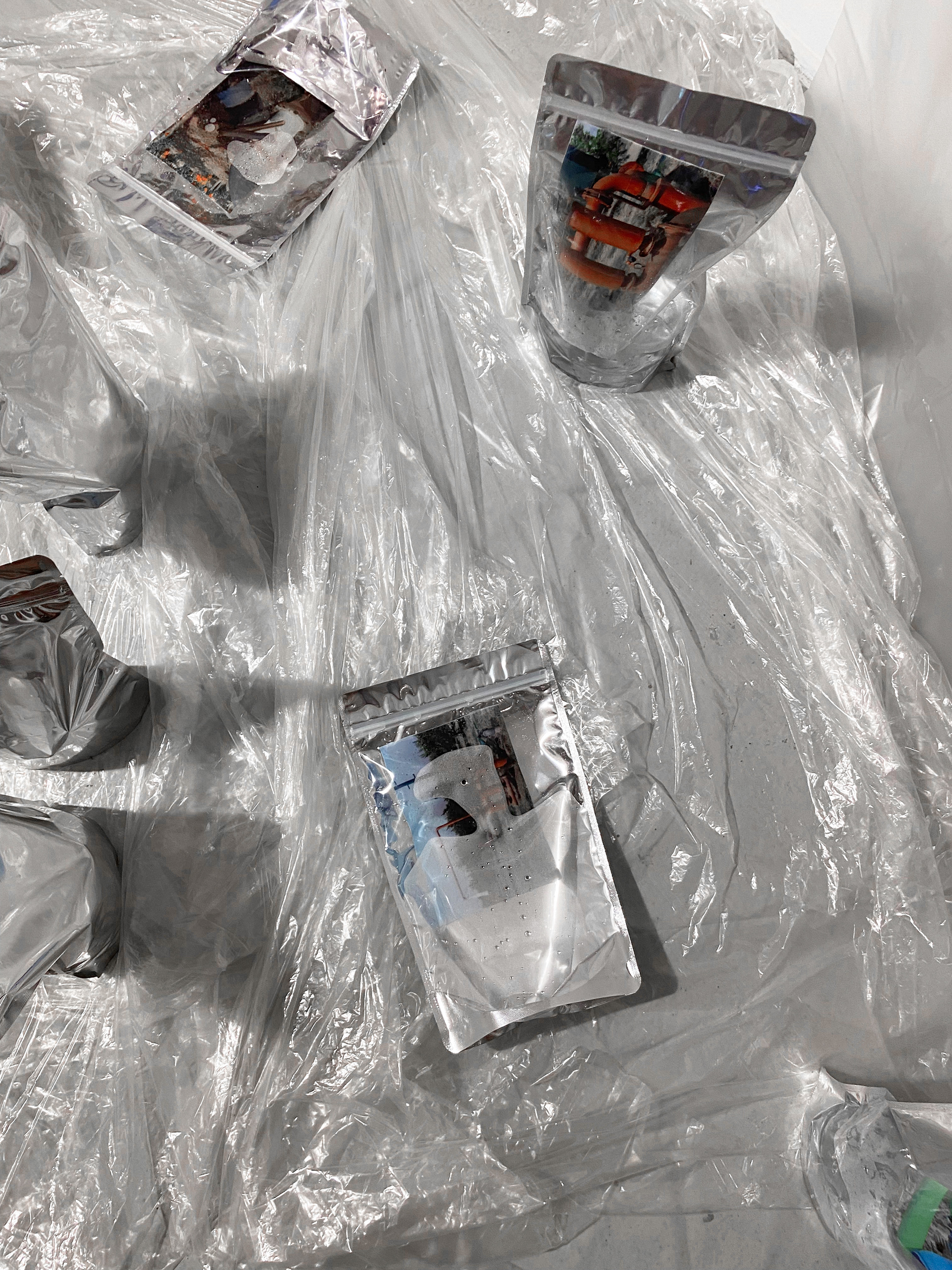 Photo prints, cloth, ziplock bags, water, video-loop 3'14''