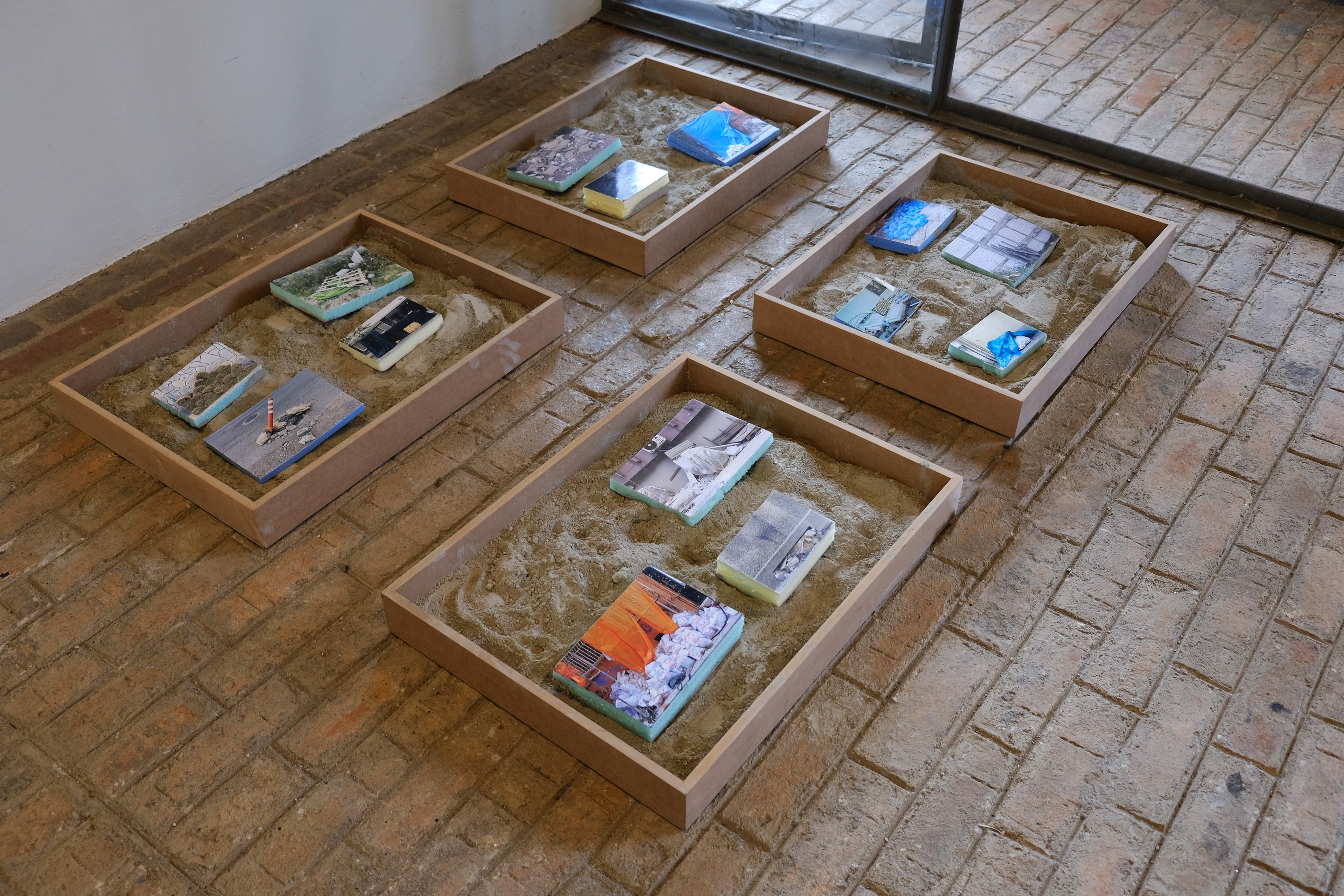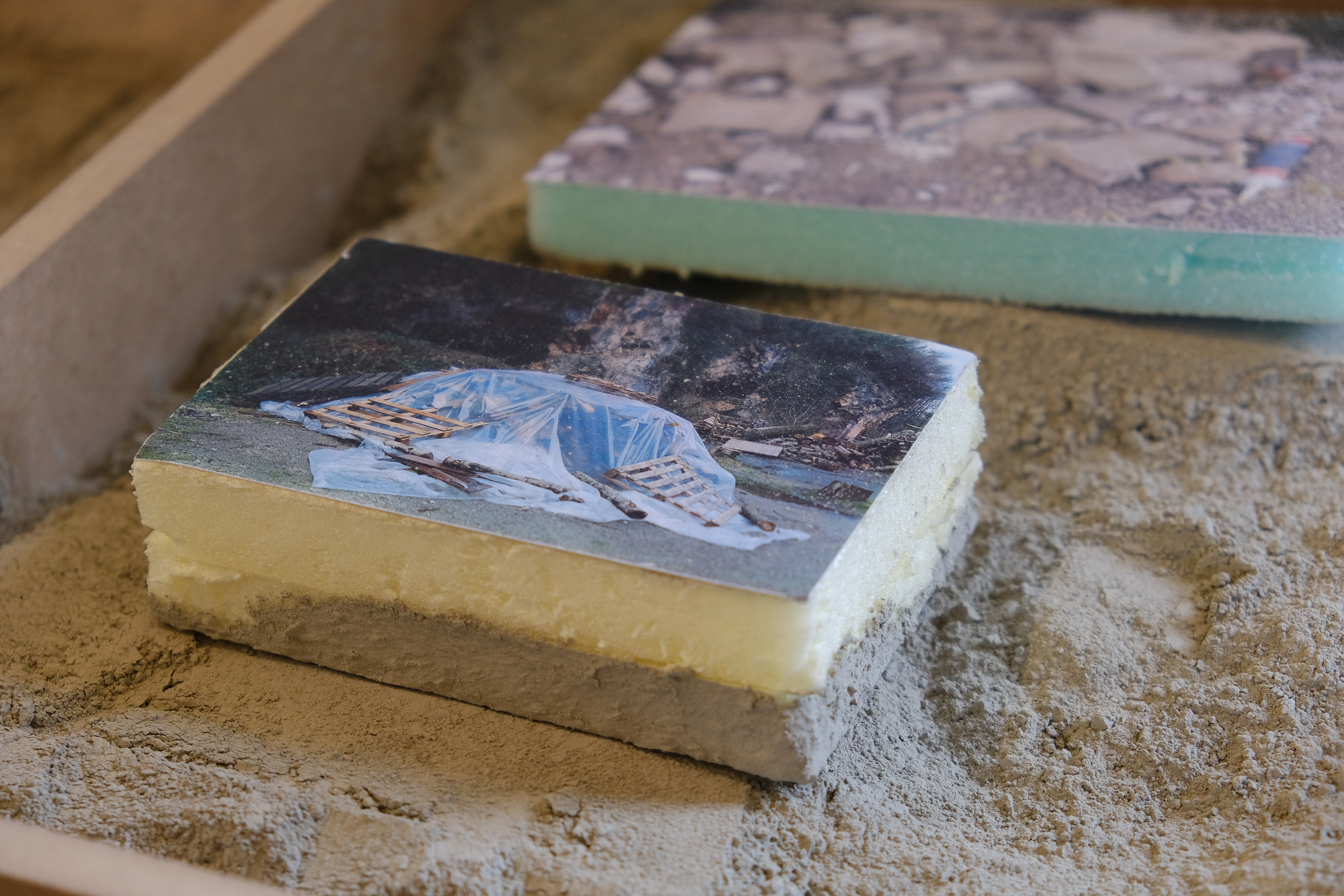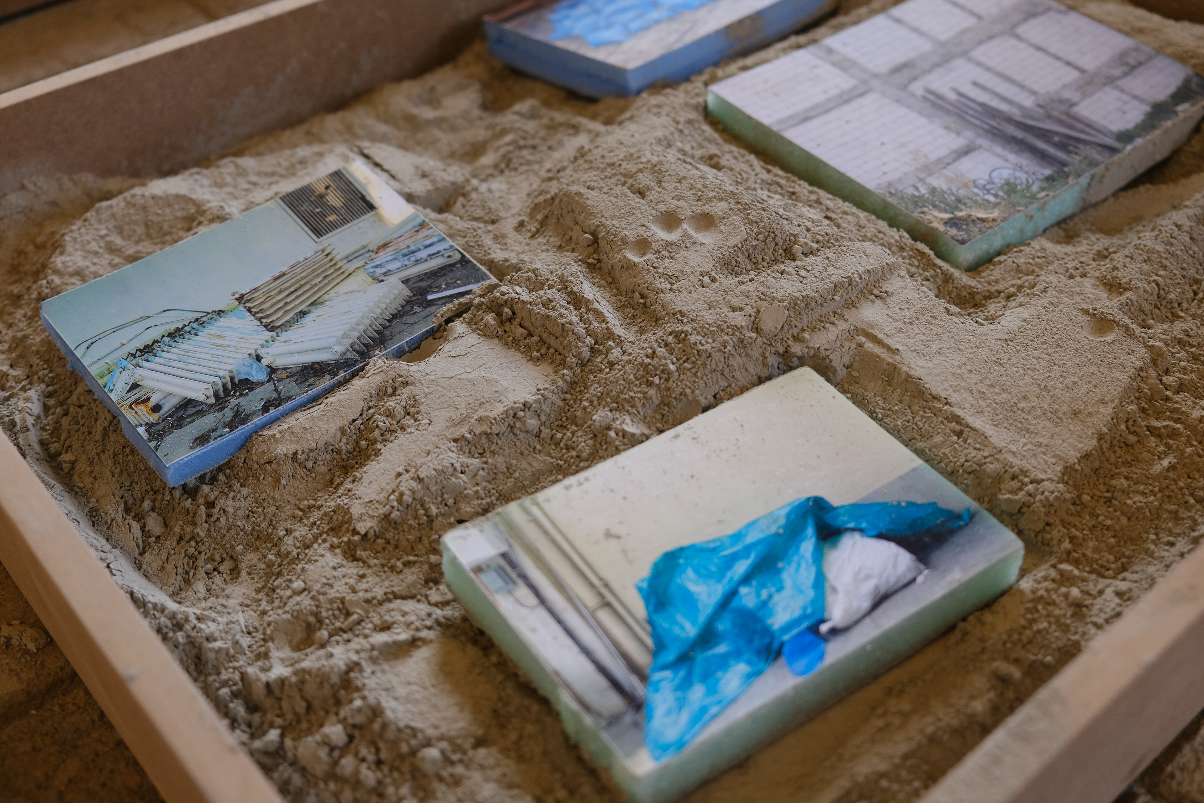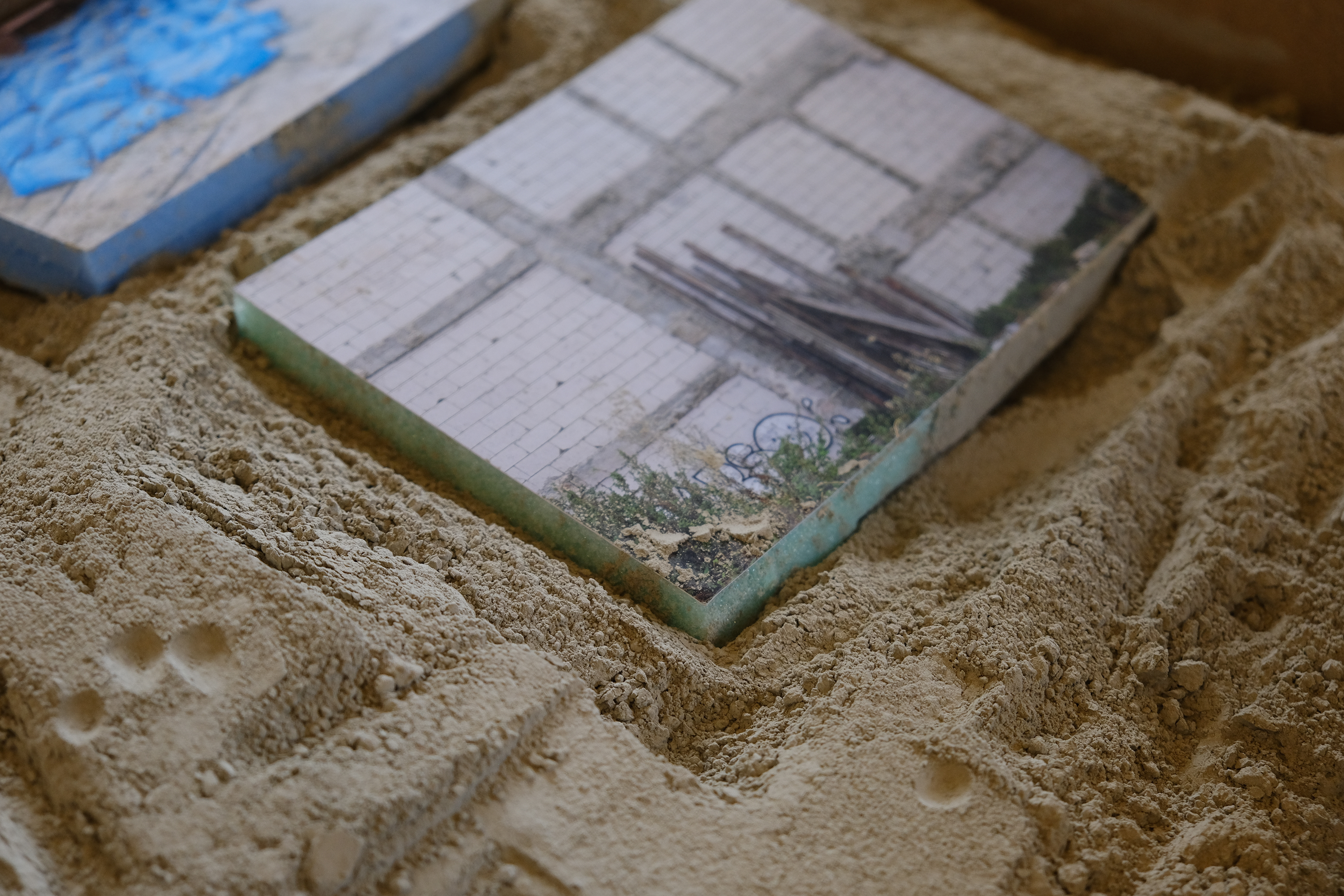 In the installation work titled Sandbox, includes the photographs I took of the gathered industrial forms that I enountered during my walks in the city, Instead of using a frame I combined the photographs by using a styrofoam, I tried to catch a closeness with the other building and industrial materials in the photographs. Installing the work on the floor causes the viewer to make physical movements such as bending and standing up. The work, which took place in the Museum Gazhane, also establishes a relationship with the recently restored and transformed building structure of the Gazhane space.