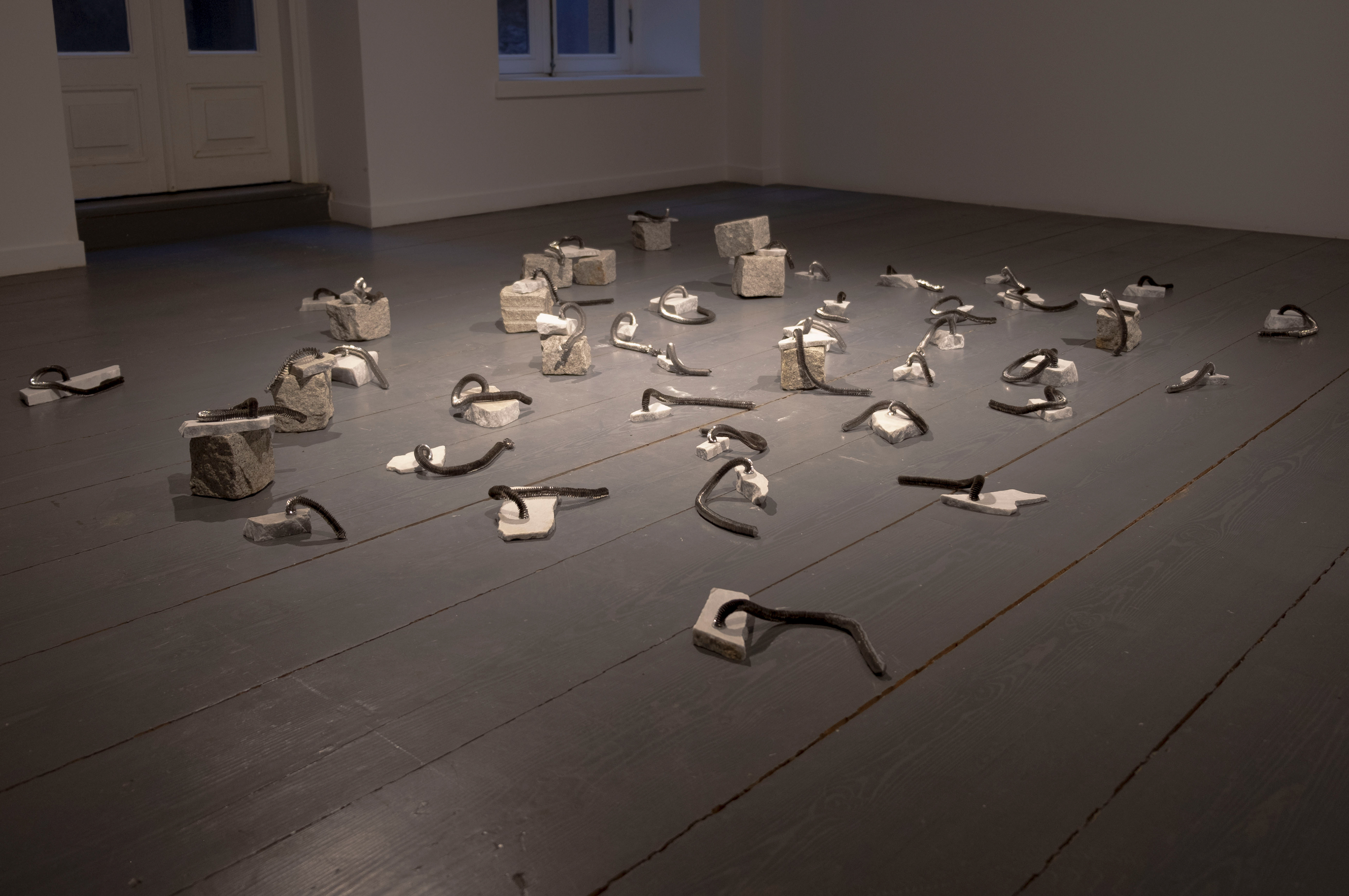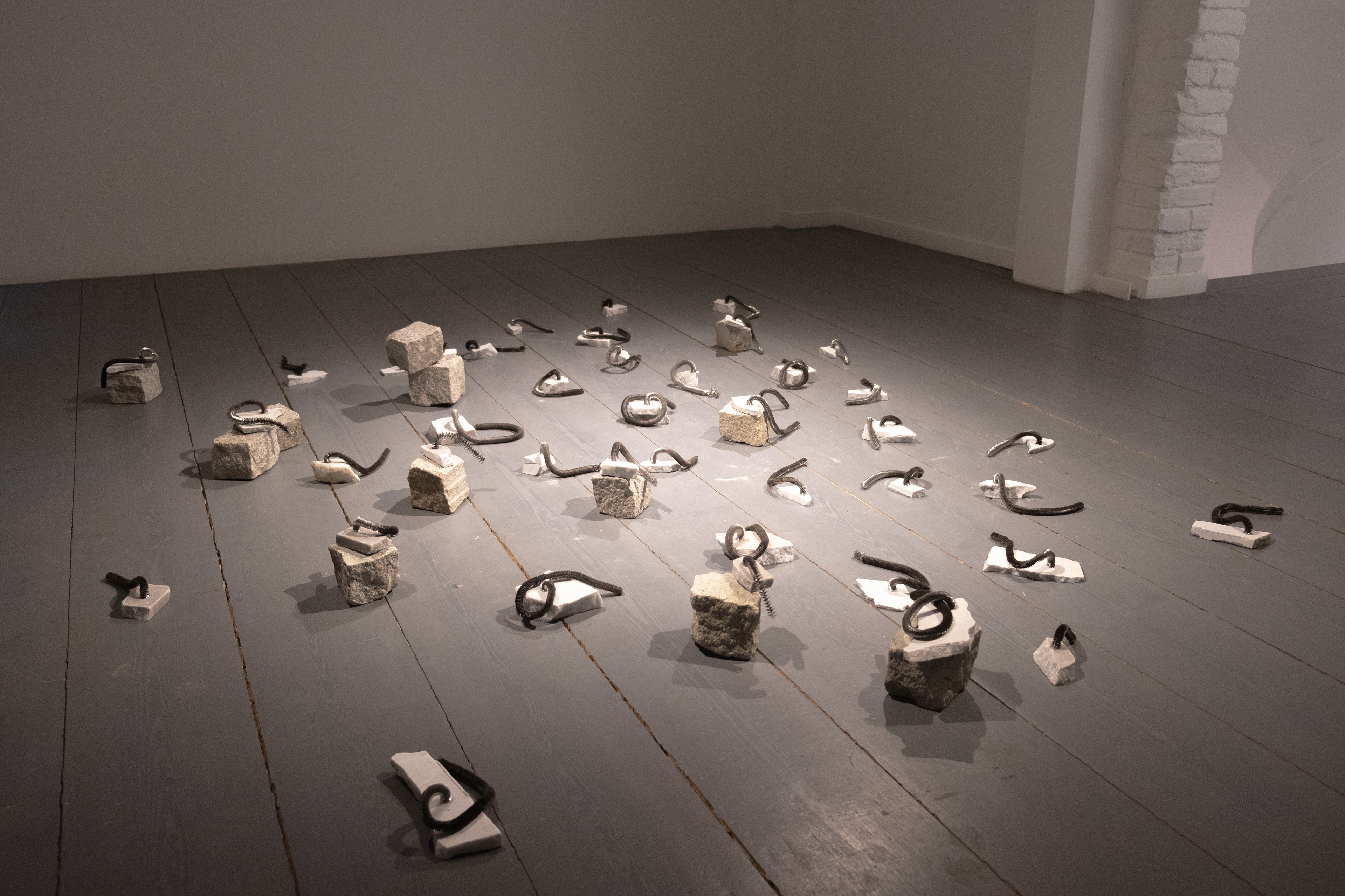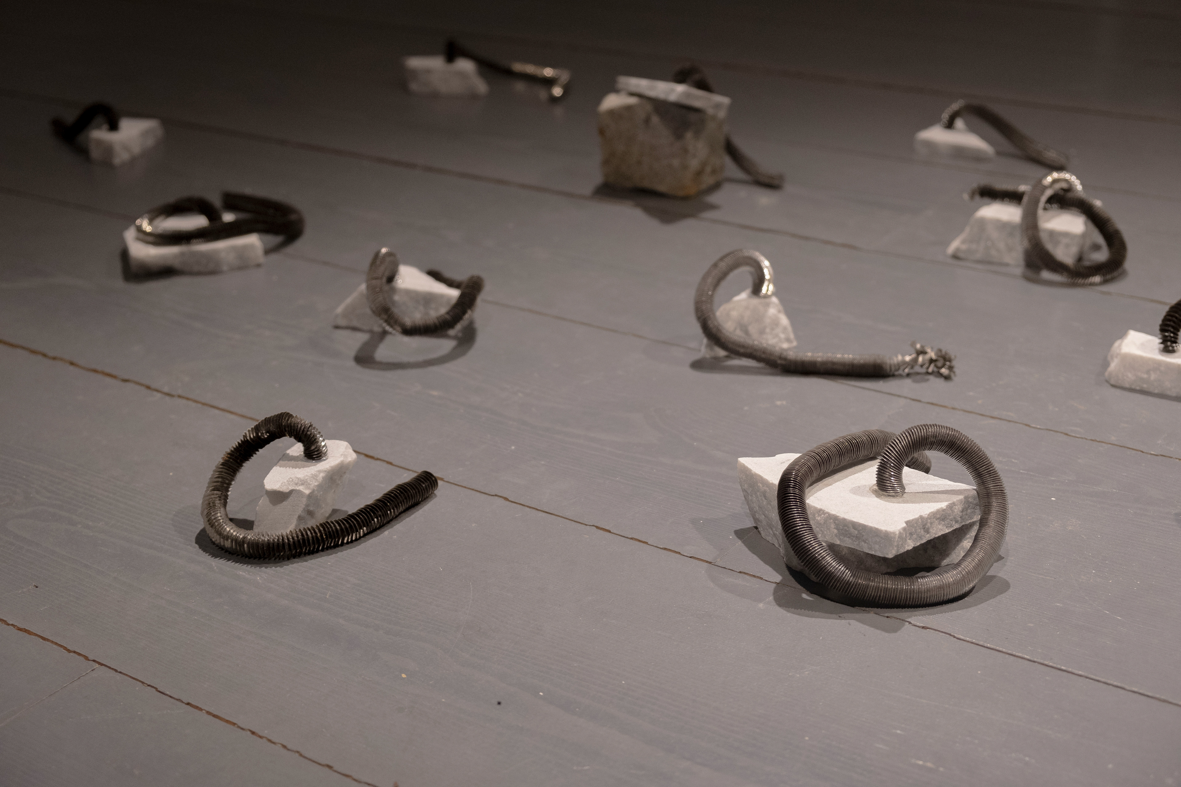 Spirals, an installation made with found marble fragments and iron filings, reconstructs two distinct forms of waste; industrial and artistic, within an eclectic sculptural language.