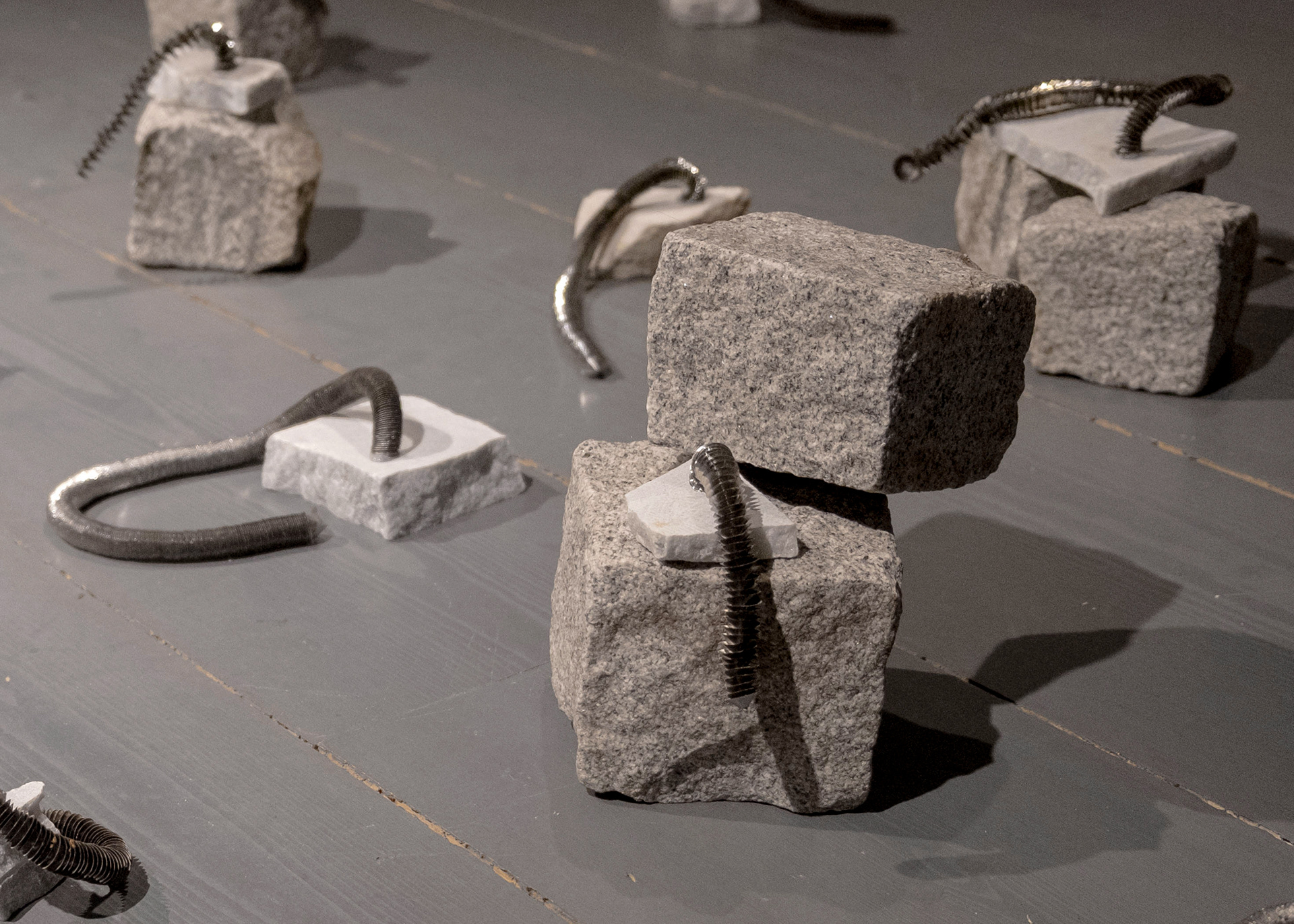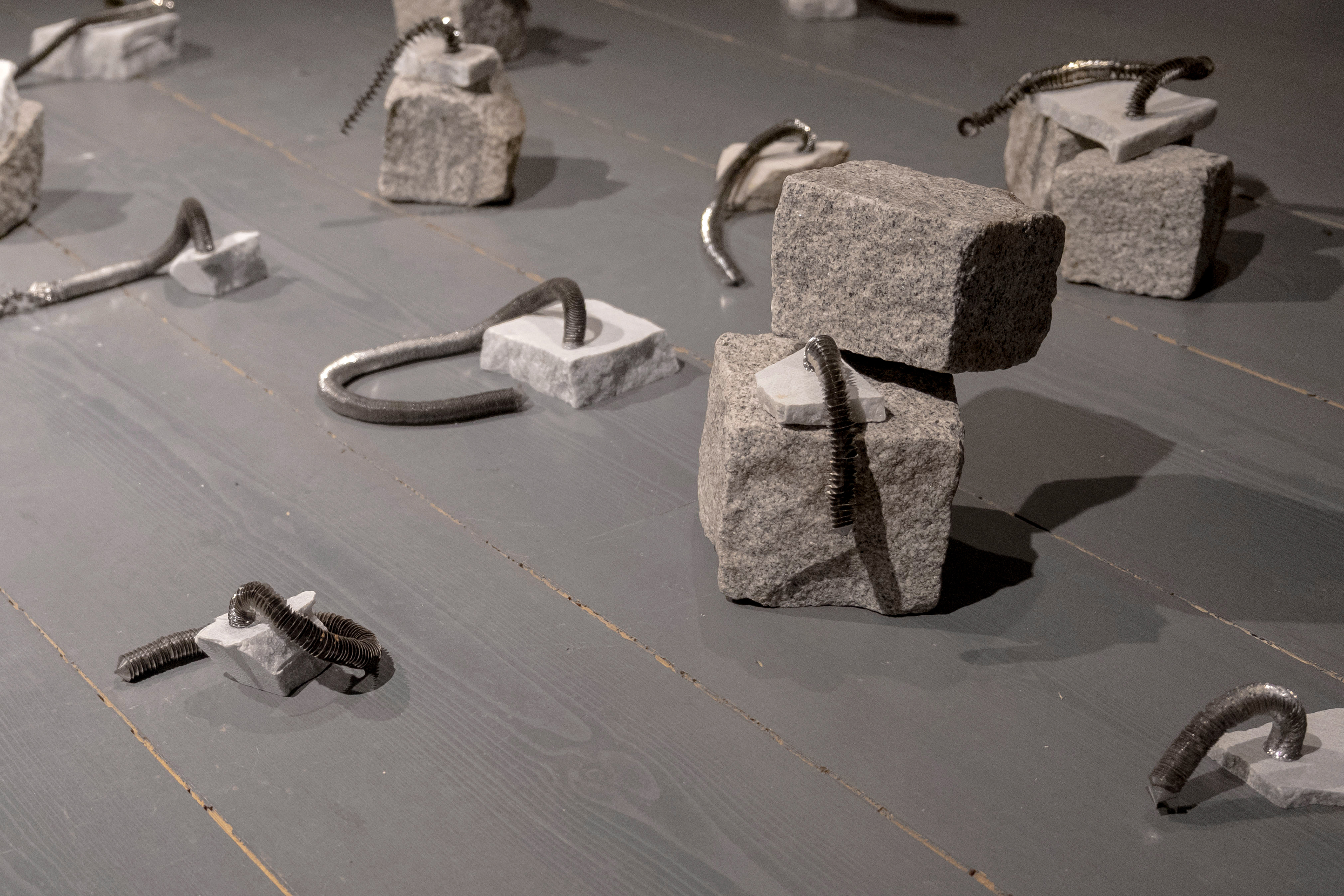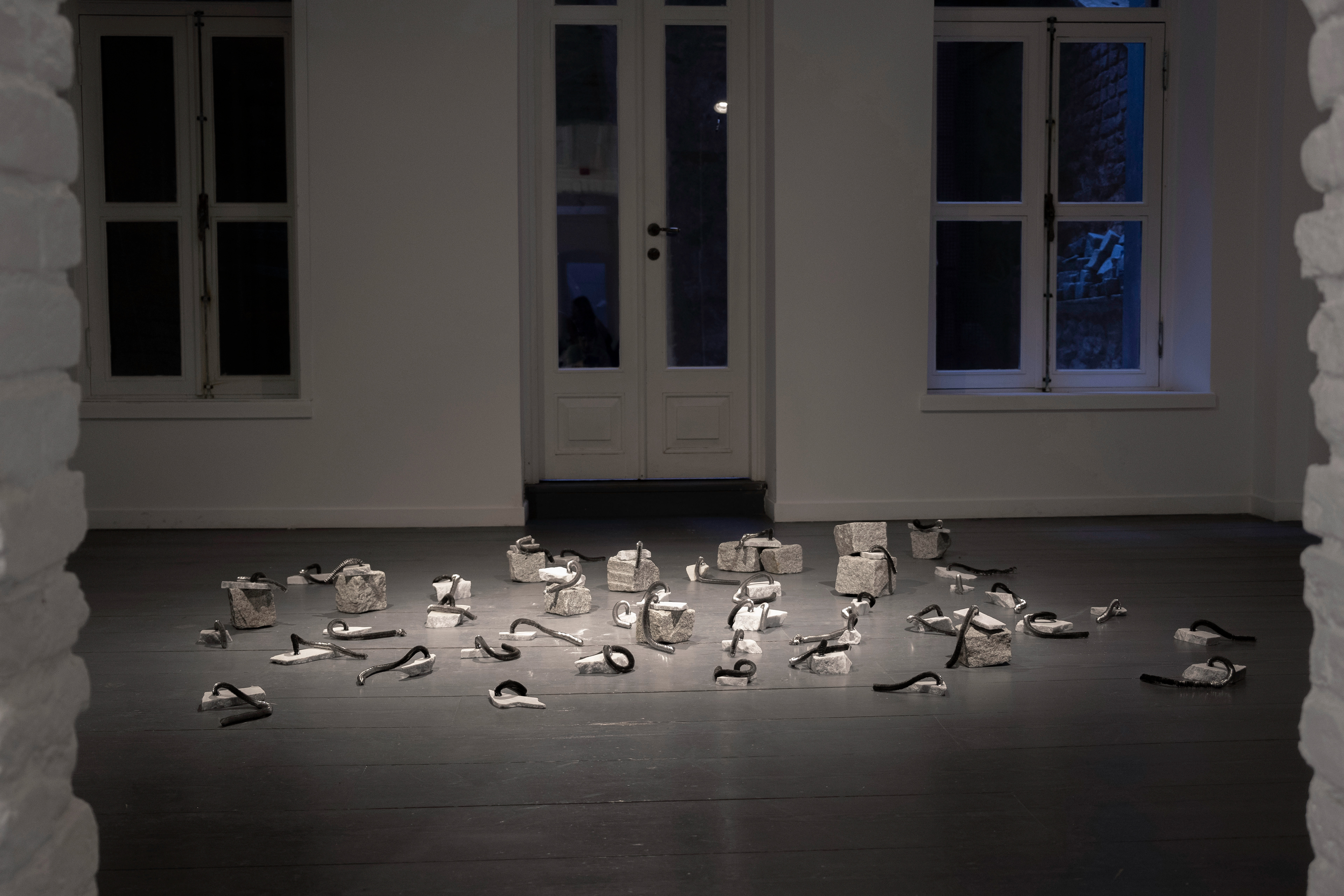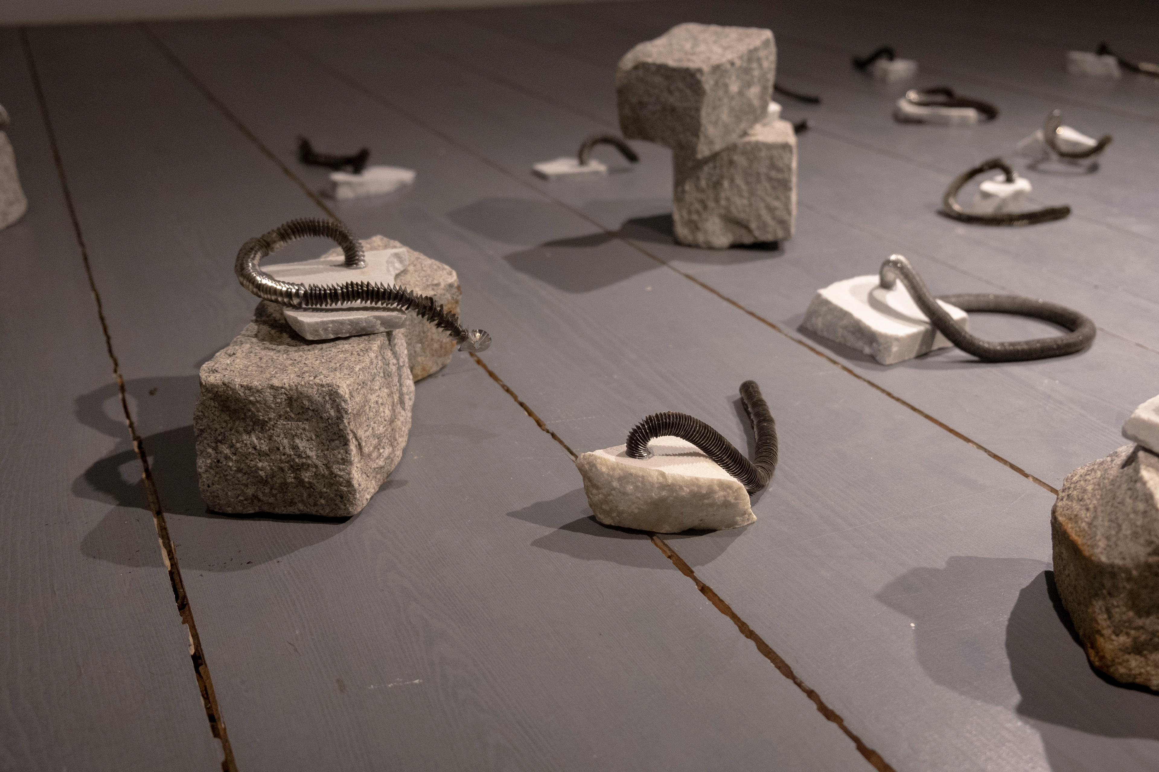 Spirals, an installation made with found marble fragments and iron filings, reconstructs two distinct forms of waste; industrial and artistic, within an eclectic sculptural language.